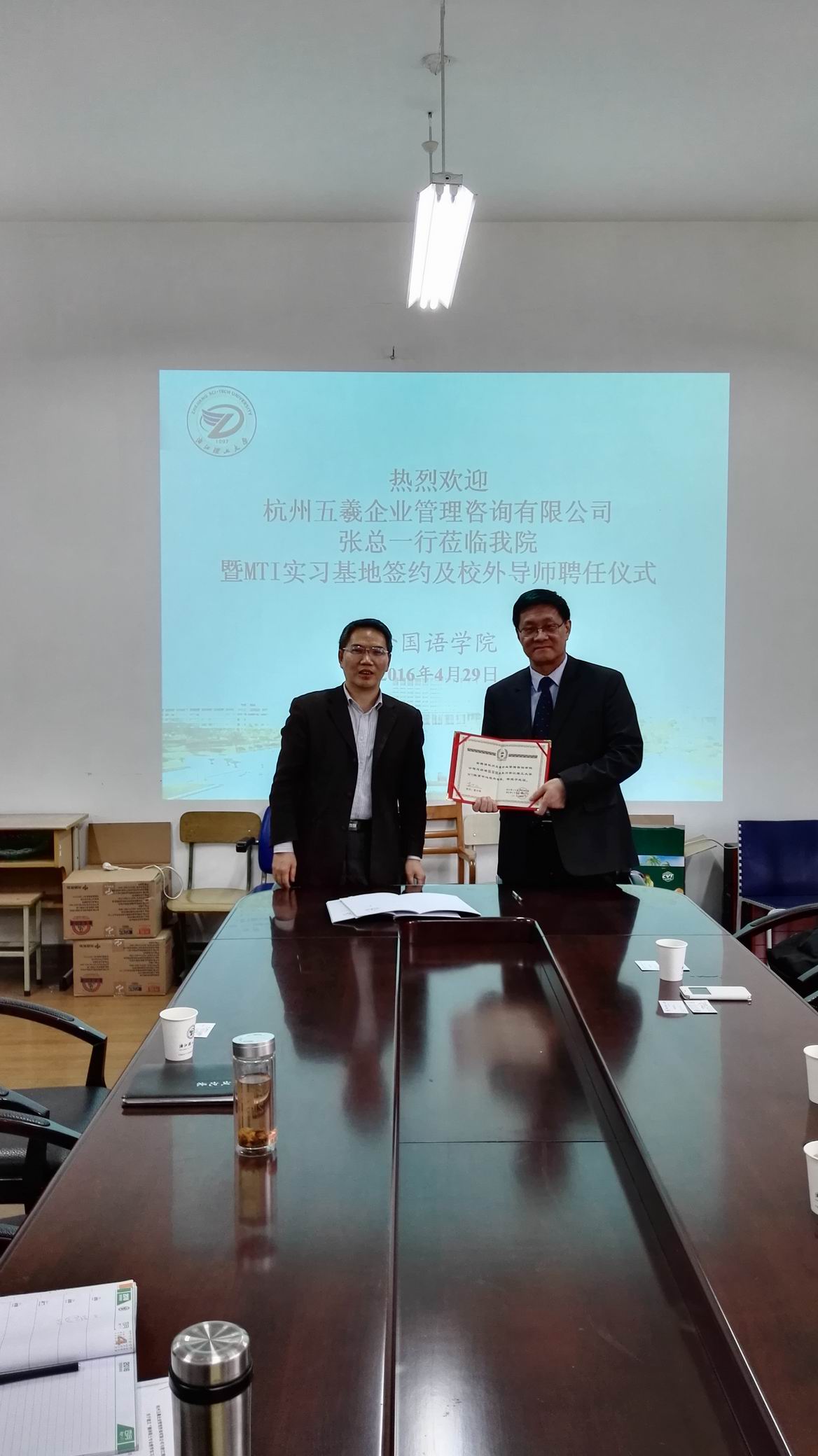 4月29日下午,外国语学院与五羲国际资产管理有限公司签订了战略合作协议,双方将共建校外实训基地。