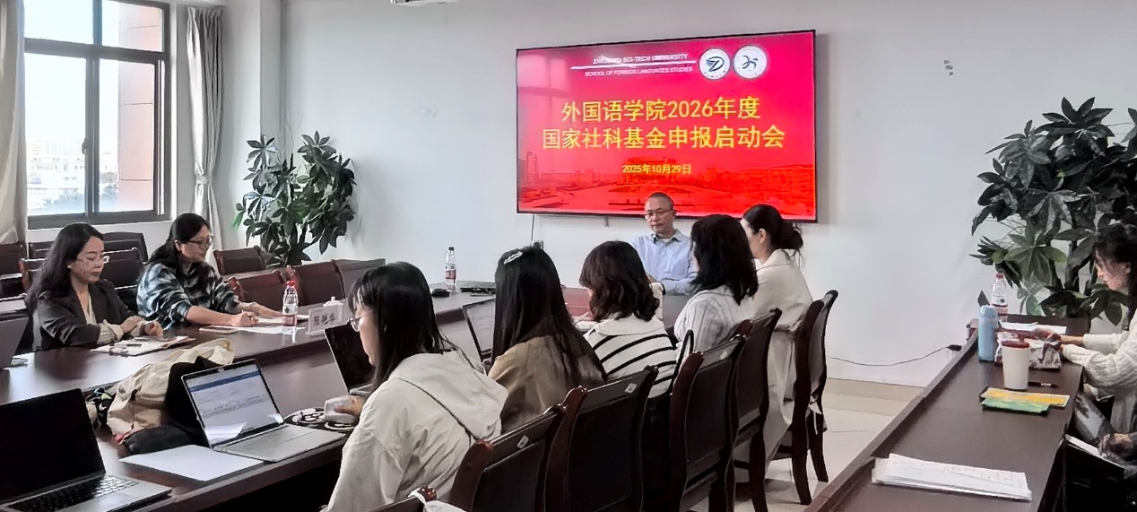 为进一步凝聚科研共识、谋划创新发展,10月29日,浙江理工大学外国语学院召开2026年度国家社科基金申报动员会。会议邀请人文社会科学处副处长陈艳华参会指导,学院院长文炳、副院长饶萍出席,学院拟申报教师参加交流。会议由学院学术副院长莫亚萍主持。
