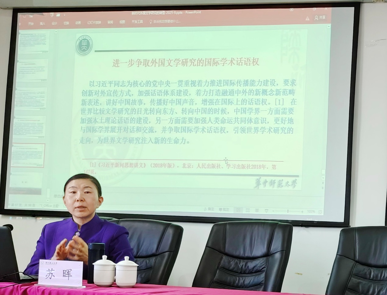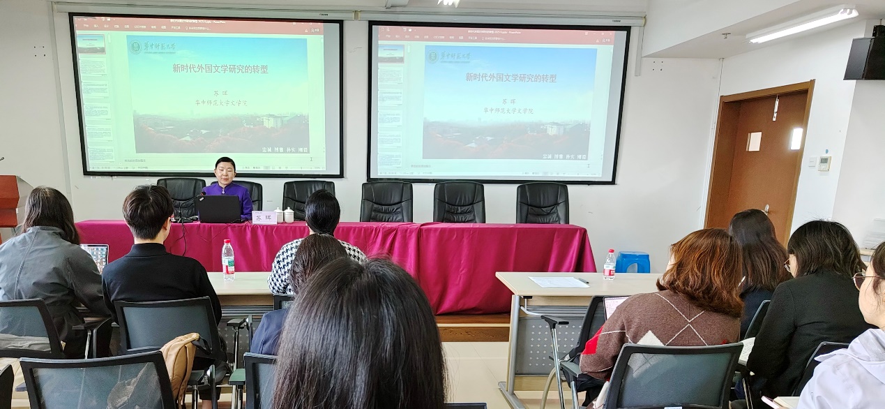 11月10日上午,华中师范大学苏晖教授应邀为外国语学院带来了一场题为“新时代外国文学研究的转型”的学术讲座。讲座在25号楼718报告厅举行,由外国语学院副院长饶萍教授主持,从事外国文学研究的学院教师到场参会。