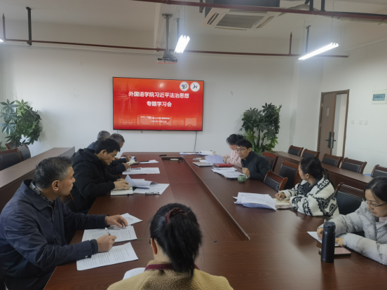 2025年12月15日,外国语学院党委在25-612会议室召开理论学习中心组(扩大)会议,围绕习近平法治思想开展集中学习研讨,学院理论中心组成员参加会议,会议由学院党委书记张祖品主持。